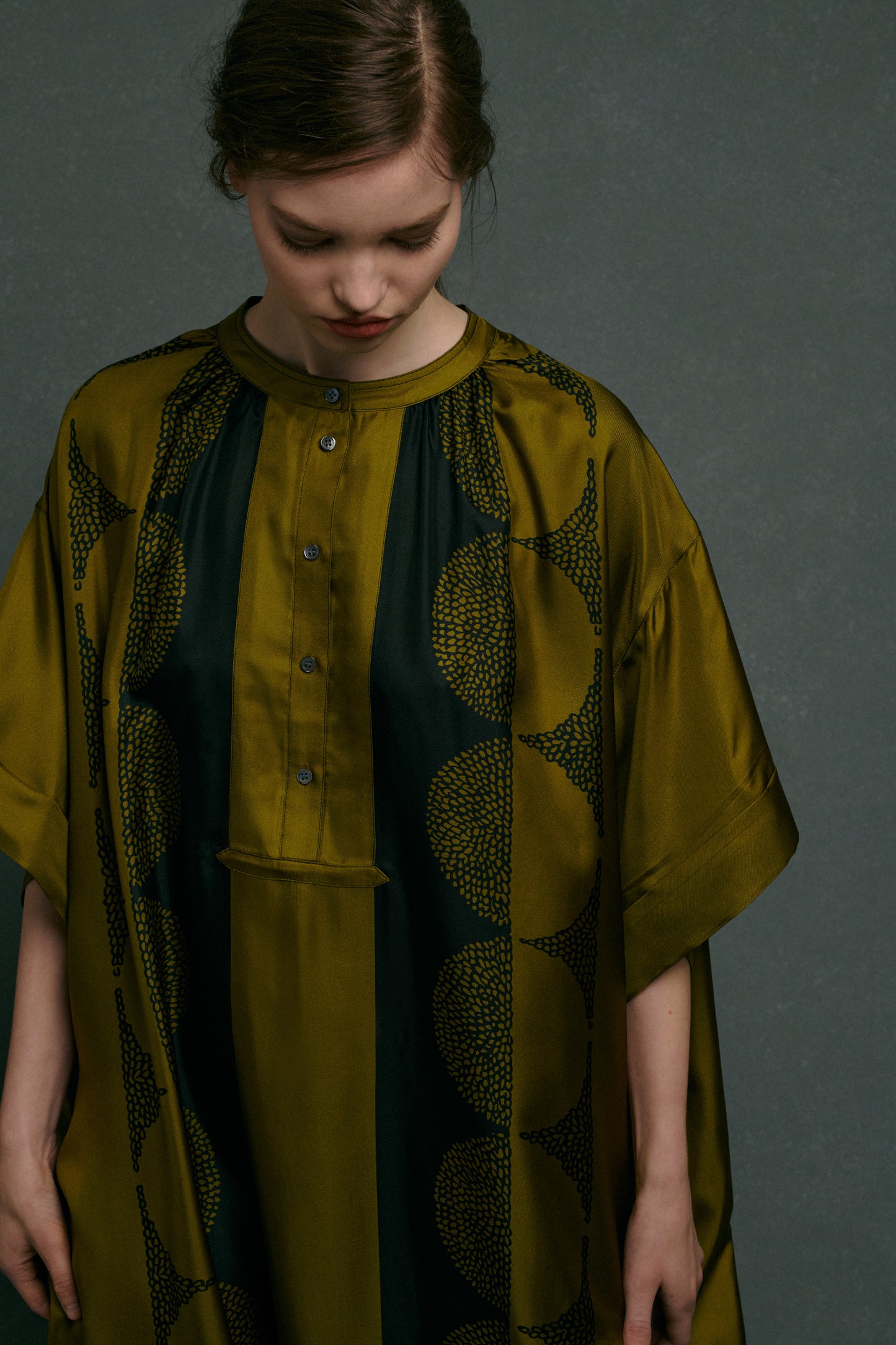 Robe longue à manches courtes en twill de soie imprimé "Pochoir"